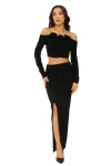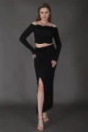 Off-shoulder detayları, zarif çiçek süslemeleri ve akıcı kesimiyle hem zarafet hem modernliği bir arada sunan bu iki parçalı takım, özgün stilinizi en iyi şekilde yansıtacak.